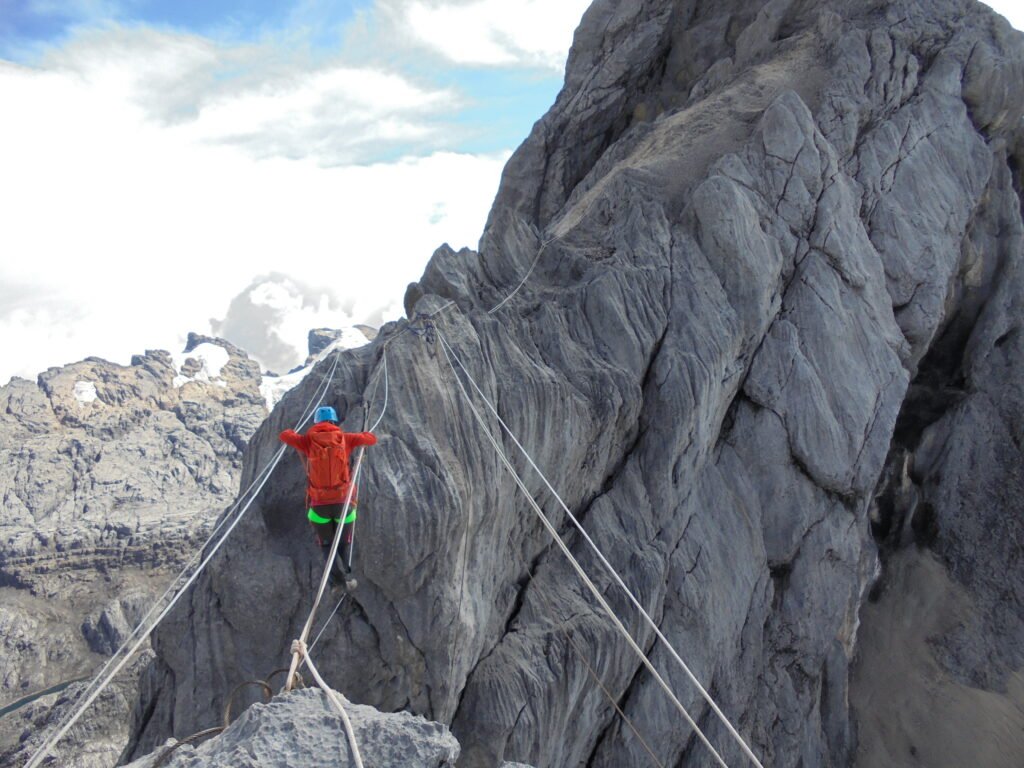 In the past, climbers crossed this section by hanging completely in mid-air, pulling themselves across the rope. Today, fixed lines allow climbers to walk across while clipped in, but the exposure remains real. Wind, weather, and mental focus play a major role here. Even experienced climbers feel the pressure in this section.