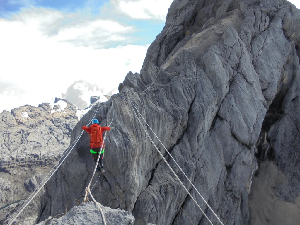 One of the most iconic and exposed sections of Carstensz is the Tyrolean Traverse. This crossing spans a deep gap between limestone ridges and requires climbers to move sideways while fully secured to steel cables or ropes.